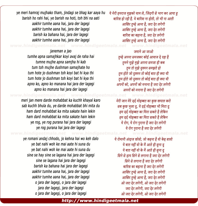 Lyrics of Aakhir Tumhe Aana Hai Jara Der Lagegi - आखिर तुम्हे आना है जरा देर लगेगी