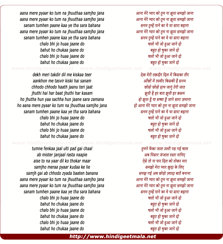 Lyrics of Aana Mere Pyar Ko Na Tum Jhuta Samjho Jana - आना मेरे प्यार को तुम ना झूठा समझो जाना