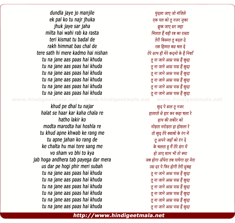 Lyrics of Aas Paas Hai Khuda (Unplugged) - धुंदला जाए जो मंजिलेdundla jaye jo manjile