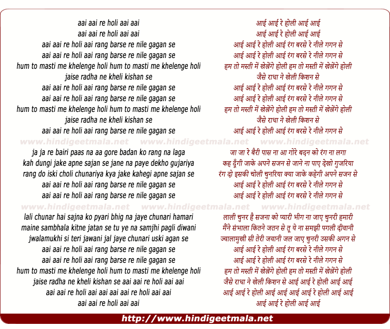 Lyrics of Aayee Aayee Holi - आई आई होली