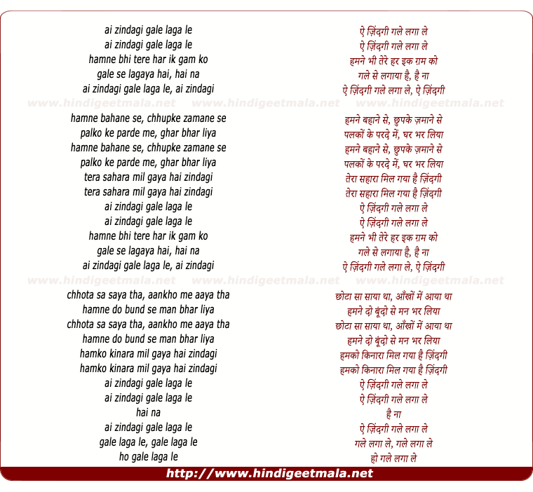 Lyrics of Ae Zindagi Gale Lagaa Le, Hamane Bhi Tere Har Ik Gam Ko - ऐ ज़िंदगी गले लगा ले, हमने भी तेरे हर इक गम को