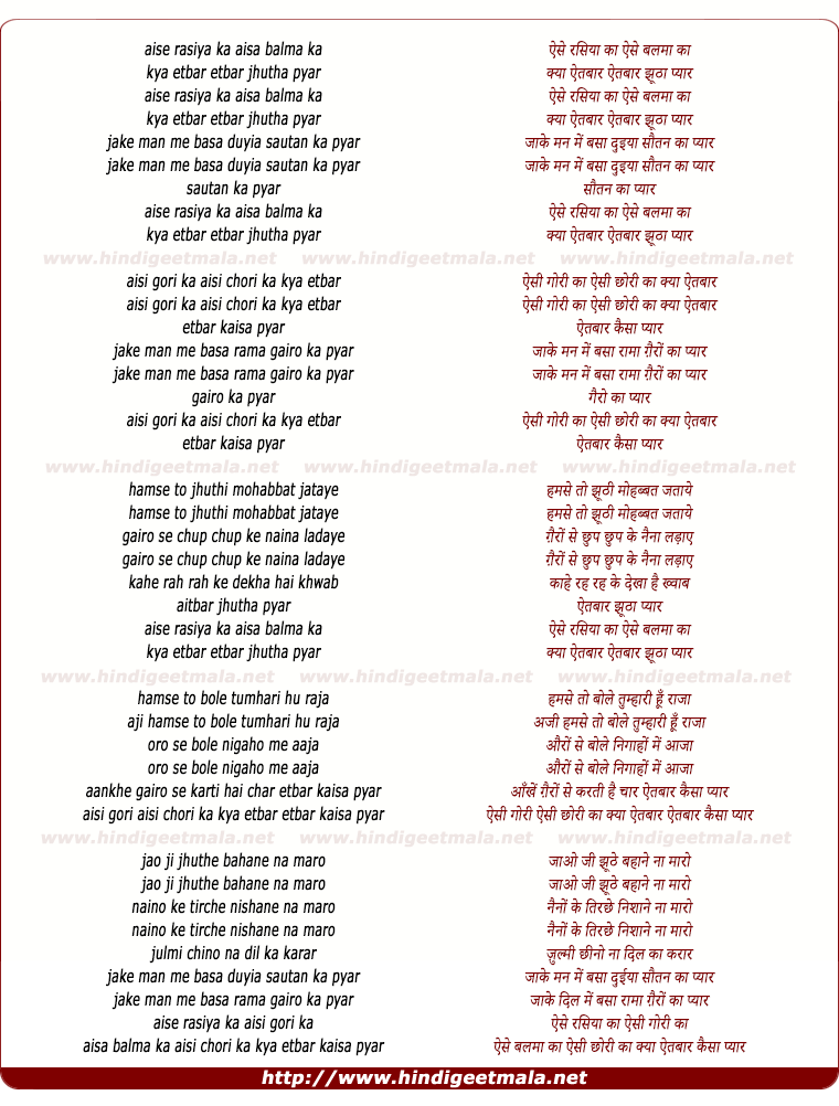 Lyrics of Aise Rasiya Ka Aisa Balma Ka Kya Aitbaar - ऐसे रसिया का ऐसे बलमा का क्या ऐतबार