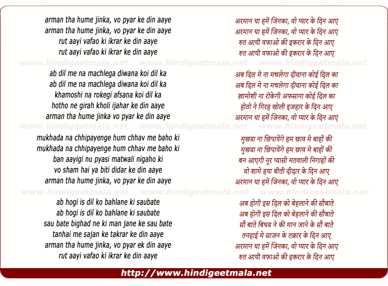 Lyrics of Armaan Tha Humein Jinka, Vo Pyar Ke Din Aaye - अरमान था हमें जिनका, वो प्यार के दिन आए