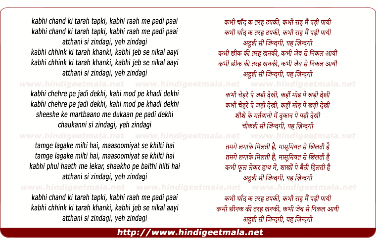Lyrics of Atthani Si Zindagi - अट्ठन्नी सी जिन्दगी