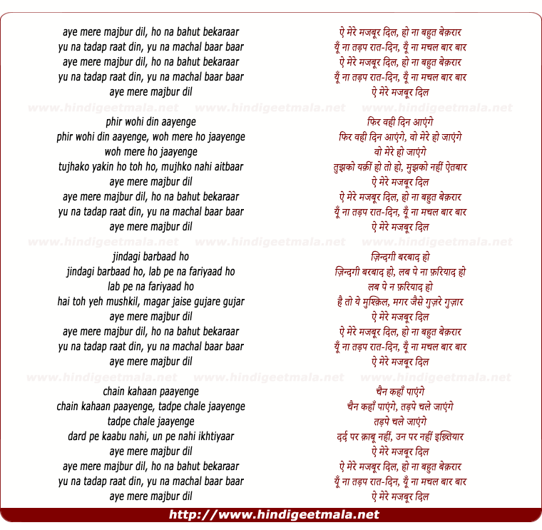 Lyrics of Ae Mere Majbur Dil, Ho Na Bahut Bekraar - ऐ मेरे मजबूर दिल, हो ना बहुत बेक़रार