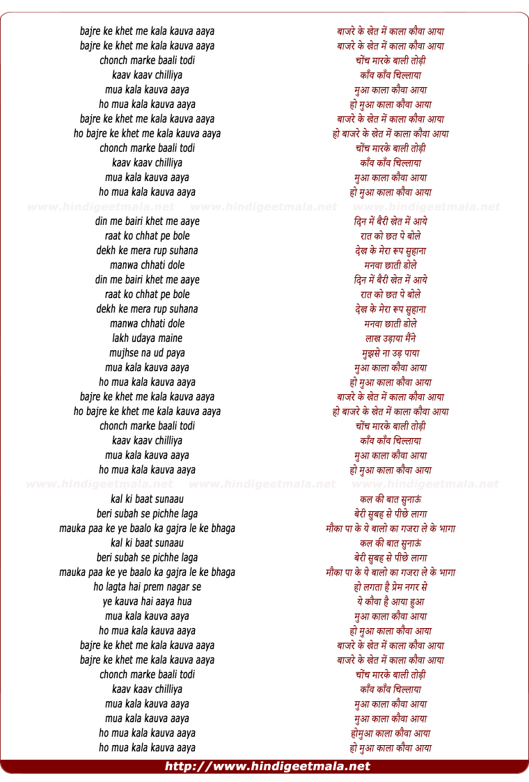 Lyrics of Baajre Ke Khet Me Kala Kauva Aaya - बाजरे के खेत में काला कौवा आयाbajre ke khet me kala kauva aaya