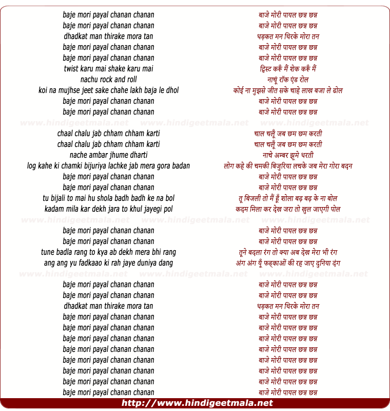Lyrics of Baje Mori Payal Chhanan Chhanan - बाजे मोरी पायल छन्न छन्नbaje mori payal chanan chanan