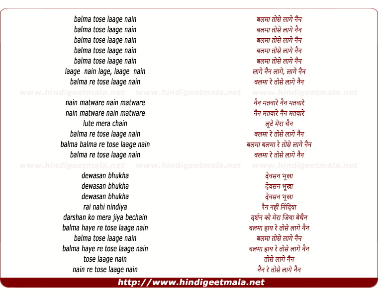 Lyrics of Balma Tose Laage Nain (Female) - बलमा तोसे लागे नैन balma tose laage nain