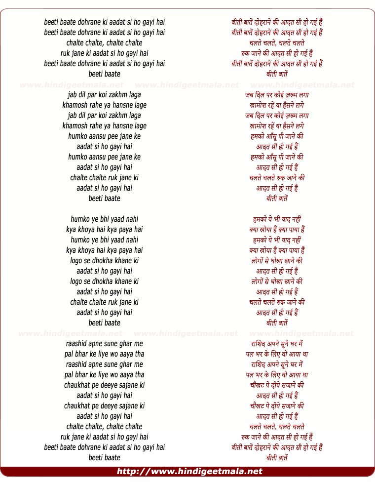Lyrics of Beeti Baate (Hariharan) - बीती बातें दोहराने की आदत सी हो गई हैं