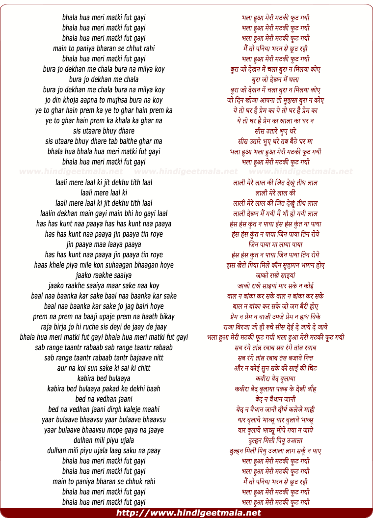 Lyrics of Bhala Hua Meri Matki - भला हुआ मेरी मटकी bhala hua meri matki fut gayi