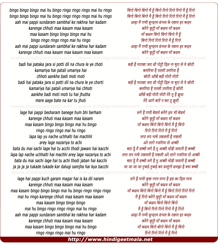 Lyrics of Bingo Bingo Bingo Main Hu Bingo - बिंगो बिंगो बिंगों मैं हूँ बिंगो bingo bingo bingo mai hu bingo ringo ringo ringo mai hu ringo