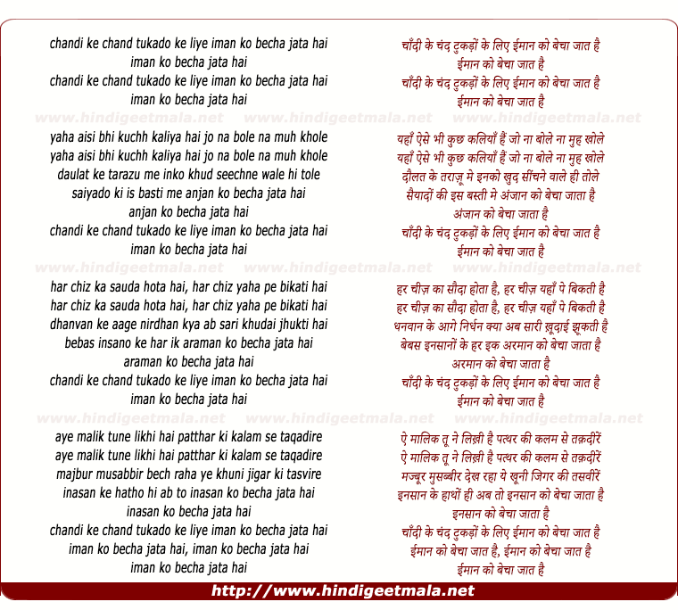 Lyrics of Chaandi Ke Chand Tukadon Ke Lie - चाँदी के चंद टुकड़ों के लिए