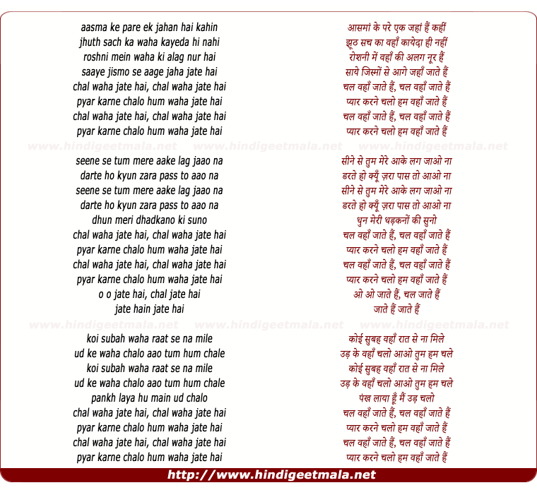 Lyrics of Chal Wahan Jate Hain - चल वहाँ जाते हैंaasma ke pare ek jahan hai kahin
