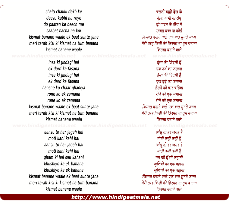 Lyrics of Chalati Chakki Dekh Ke - चलती चक्की देख के