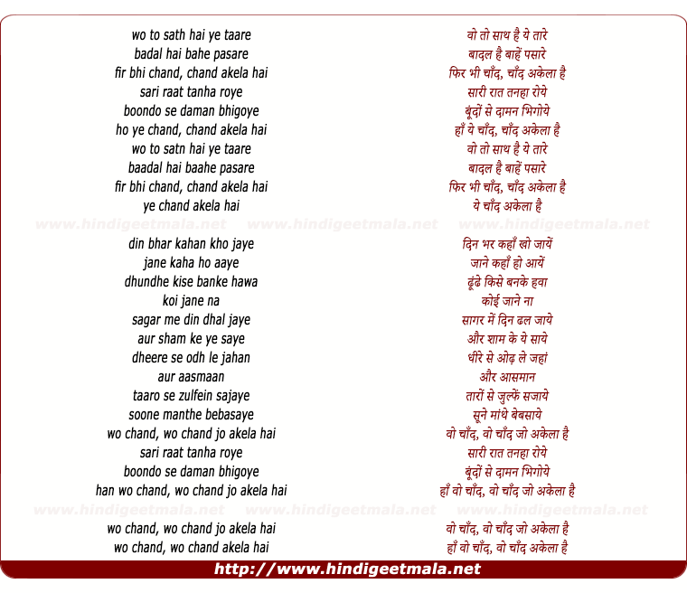 Lyrics of Chand Akela Hai - वो तो साथ है ये तारे