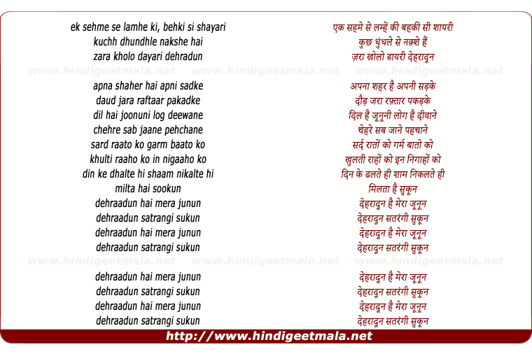 Lyrics of Dehraadun Diary - देहरादून डायरी