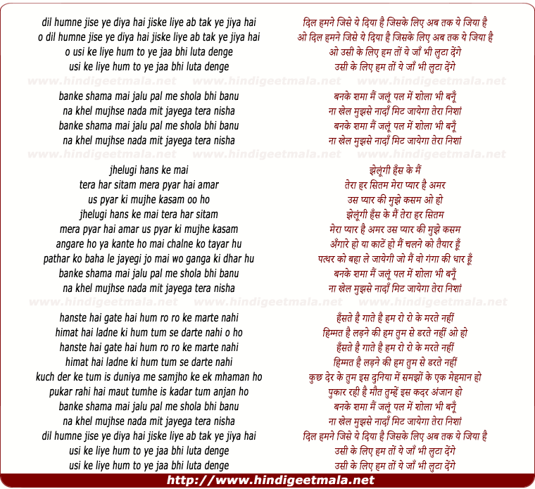 Lyrics of Dil Humne Jise - दिल हमने जिसे dil humne jise ye diya hai jiske liye ab tak ye jiya hai
