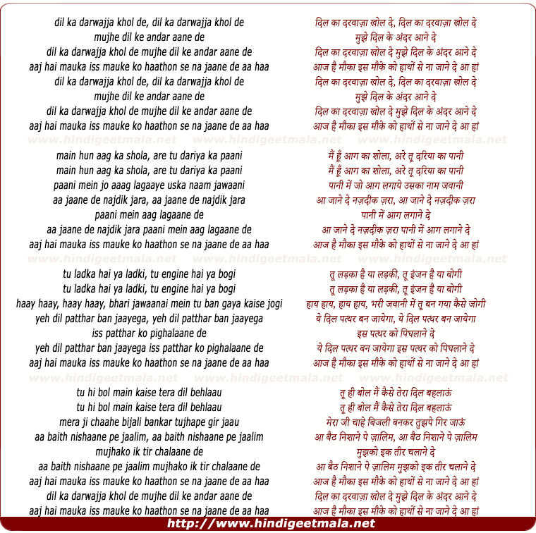 Lyrics of Dil Ka Darwajja Khol De - दिल का दरवाज़ा खोल दे