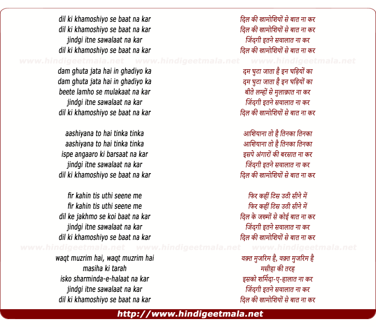 Lyrics of Dil Ki Khamoshiyo Se Baat Na Kar - दिल की खामोशियों से बात ना करdil ki khamoshiyo se baat na kar