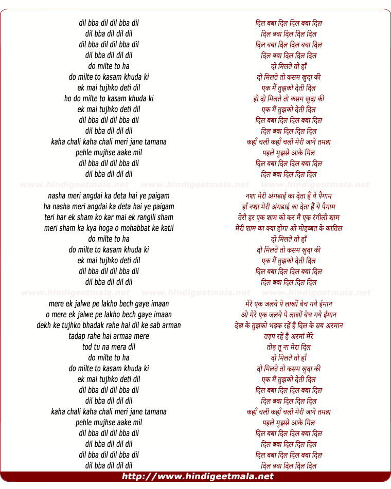 Lyrics of Do Milte Toh Kasam Khuda Ki - दो मिलते तो कसम खुदा कीdil bba dil dil bba dil