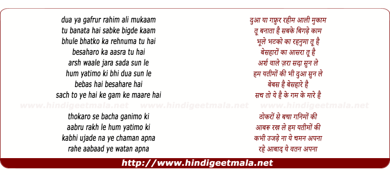 Lyrics of Dua Ya Gafrur Rahim Ali Mukam - दुआ या गफ्रुर रहीम आली मुकाम
