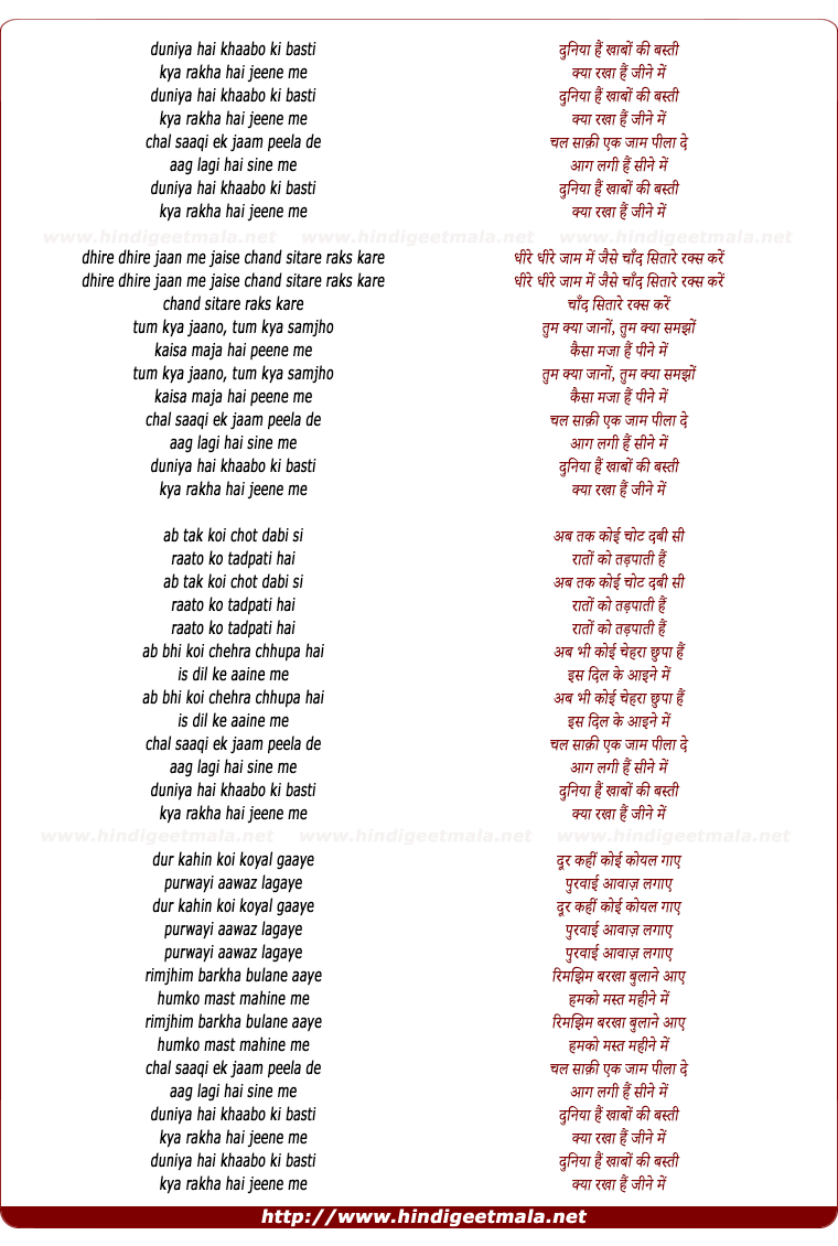 Lyrics of Duniya Hai Khwabo Kee Basti - दुनिया हैं खाबों की बस्ती