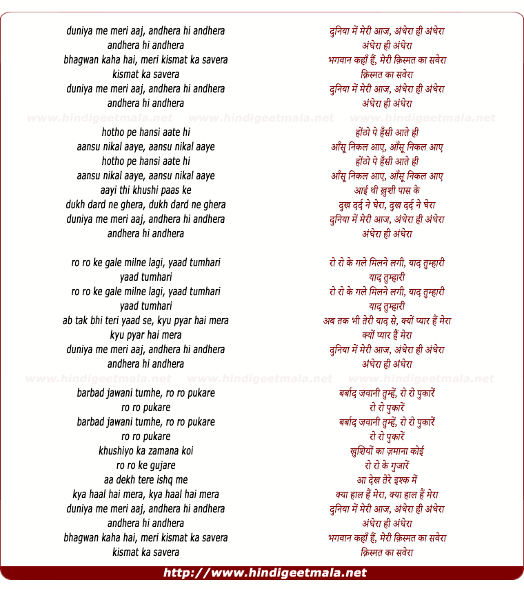 Lyrics of Duniya Me Mere Aaj, Andhera Hi Andhera - दुनिया में मेरी आज, अंधेरा ही अंधेरा