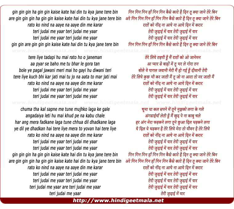 Lyrics of Gin Gin Kaise Kate Hai Din Tu Kya Jane Tere Bin - गिन गिन कैसे काटे है दिन तू क्या जाने तेरे बिन