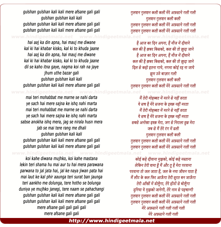 Lyrics of Gulashan Gulashan Kali Kali Mere Afasaane Gali Gali - गुलशन गुलशन कली कली मेरे अफ़साने गली गली