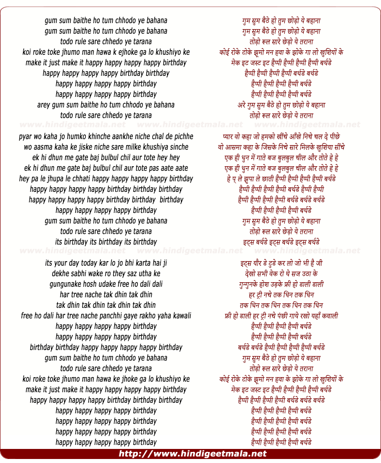 Lyrics of Gum Sum Baithe Ho Tum Happy Birthday - गुम सुम बैठे हो तुम हैप्पी बर्थडे gum sum baithe ho tum chhodo ye bahana