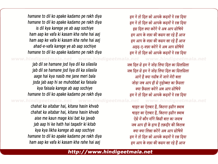 Lyrics of Hamane To Dil Ko Aapake Kadamon Pe Rakh Diyaa - हमने तो दिल को आपके कदमों पे रख दिया