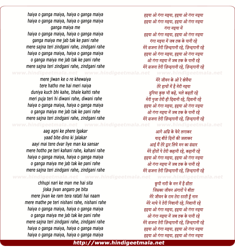 Lyrics of Hayyaa O Gangaa Mayyaa, Gangaa Mayyaa Men Jab Tak Ke Paani Rahe - हैया ओ गंगा मैया, गंगा मैया में जब तक के पानी रहे
