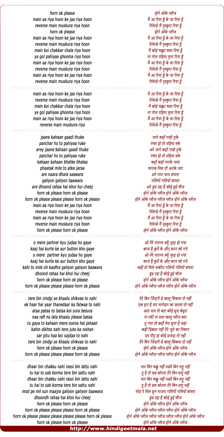 Lyrics of Horn Ok Please, Main Aa Riyaa Hu - Version 2 - होर्न ओके प्लीज मैं आ रिया हु