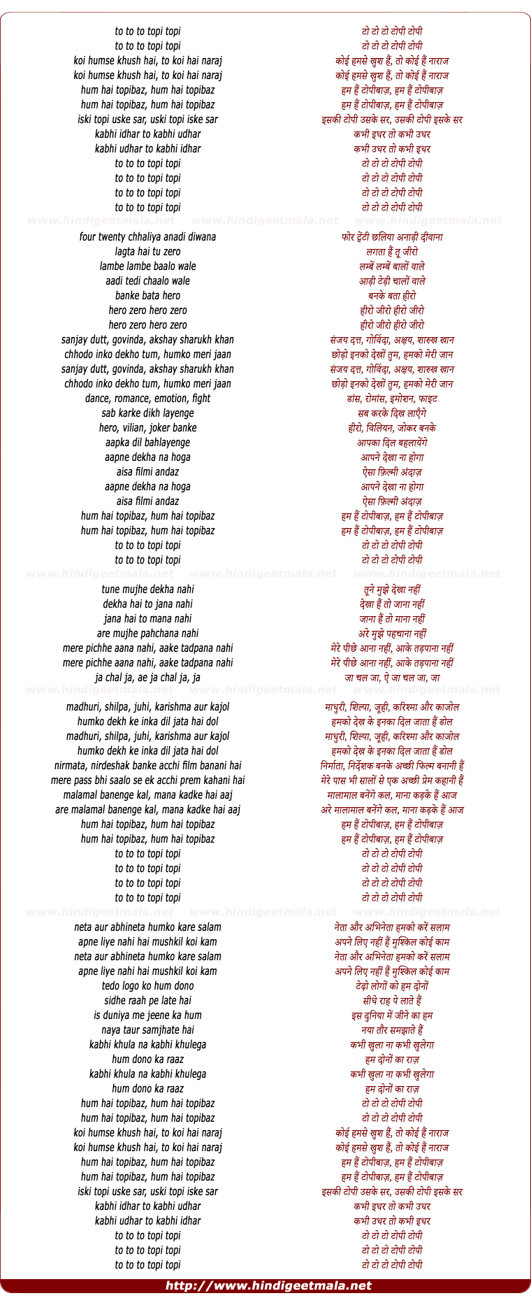 Lyrics of Koi Hamse Khush Hai To Koi Hai Naraj (Hum Hai Topi Baz) - टो टो टो टोपी टोपीto to to topi topi