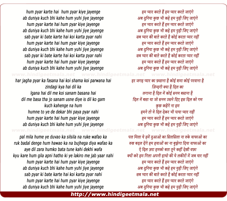 Lyrics of Hum Pyar Karte Hai, Hum Pyar Kiye Jayege - हम प्यार करते हैं, हम प्यार किये जाएंगे