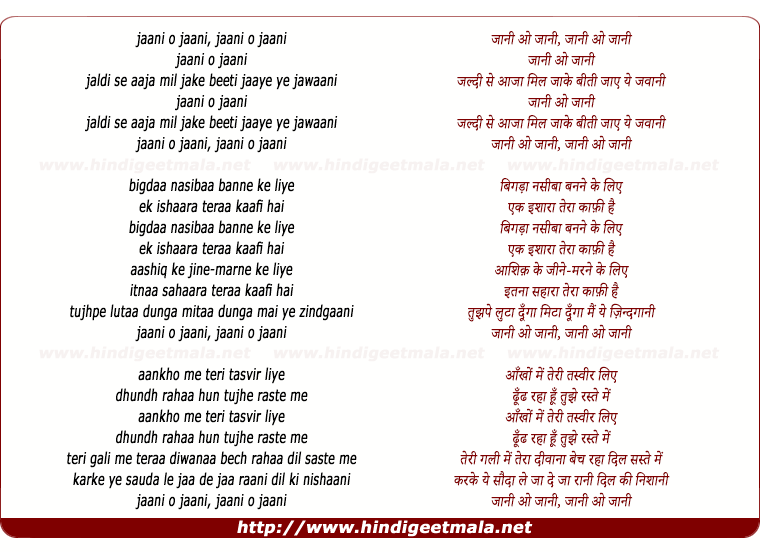 Lyrics of Jaani O Jaani Jaldi Se Aa Jaa Mil Aa Ke - जानी ओ जानी जल्दी से आ जा मिल आ के