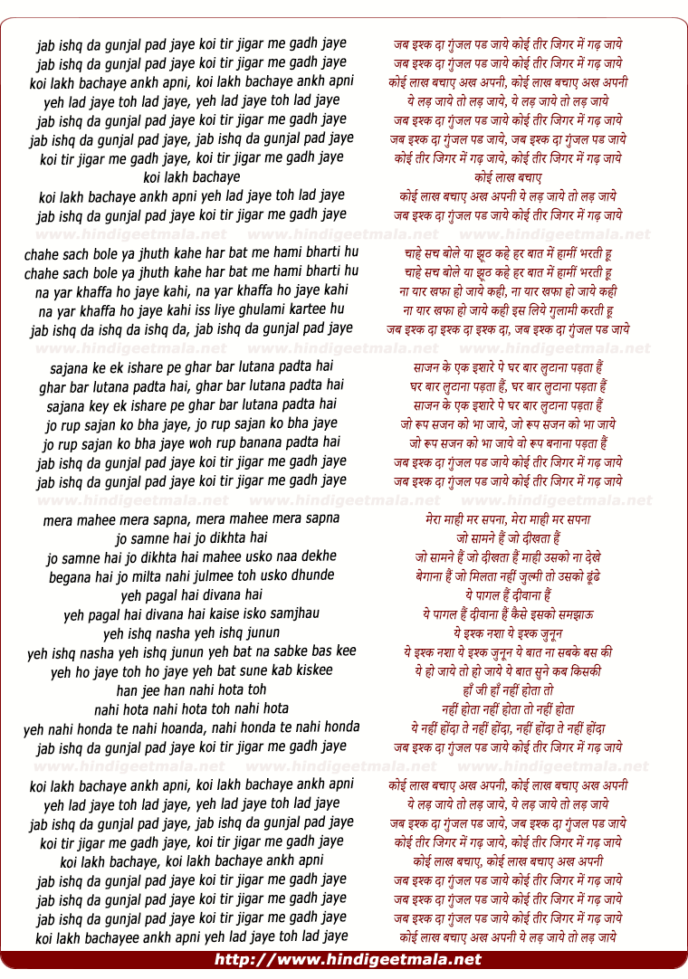 Lyrics of Jab Ishk Da Gunjal Pad Jaye - जब इश्क दा गुंजल पड़ जाये