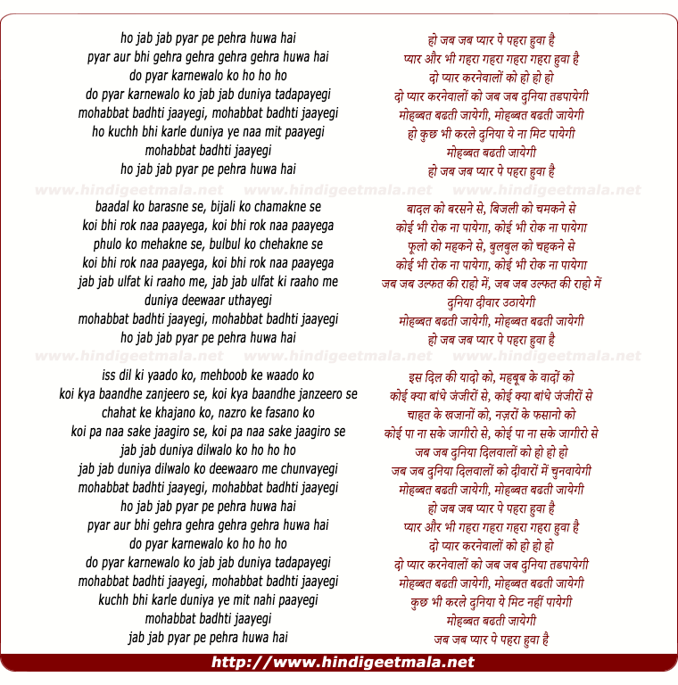 Lyrics of Jab Jab Pyar Pe Pahra Huwa Hai - जब जब प्यार पे पहरा हुआ हैho jab jab pyar pe pehra huwa hai