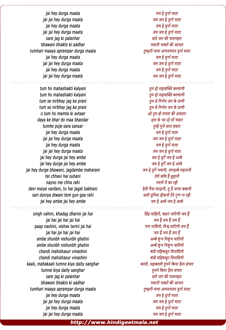 Lyrics of Jai Hey Durga Mata Jai Jai Hey Durga Mata - जय हे दुर्गा माता जय जय हे दुर्गा माता