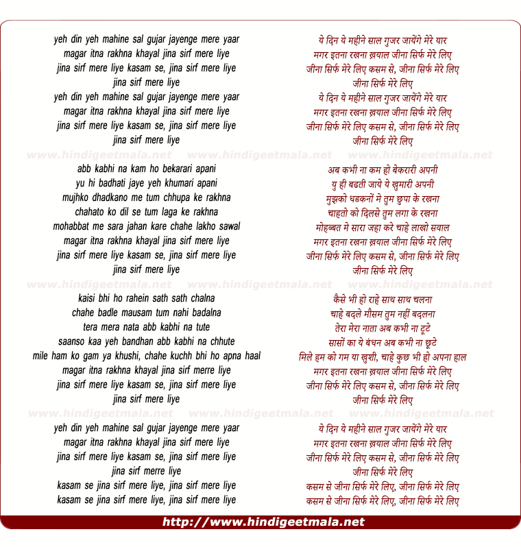 Lyrics of Jina Sirf Mere Liye Kasam Se - जीना सिर्फ मेरे लिए कसम से