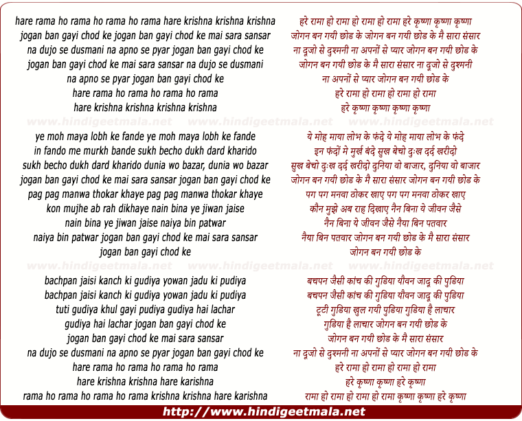 Lyrics of Jogan Ban Gayi Chod Ke, Main Sara Sansar - जोगन बन गयी छोड़ के, मैं सारा संसार
