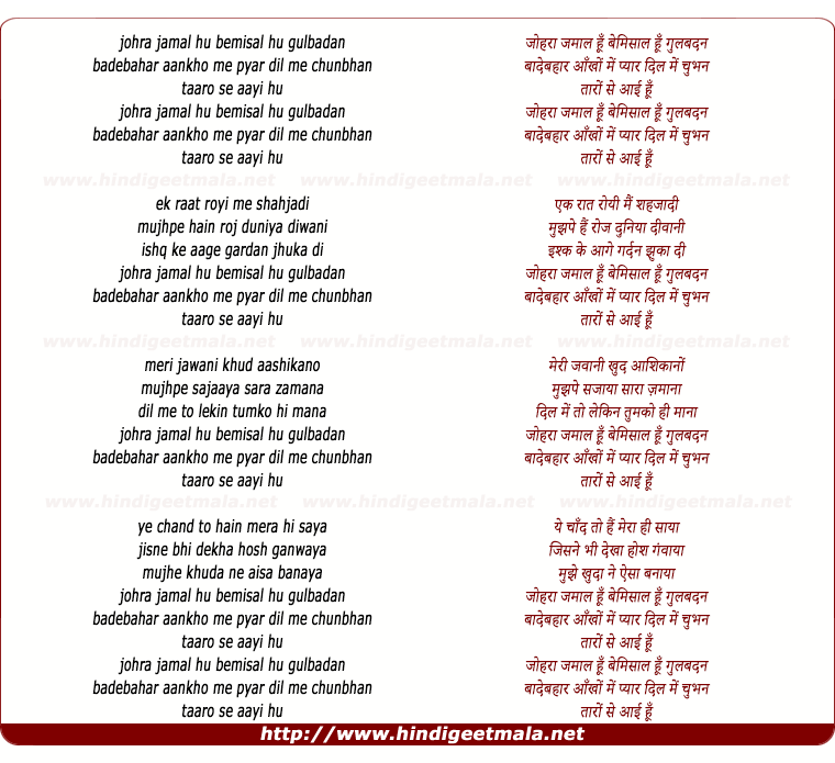 Lyrics of Johra Jamal Hu Bemisal Hu Gulbadan Bade - जोहरा जमाल हूँ बेमिसाल हूँ गुलबदन बड़े