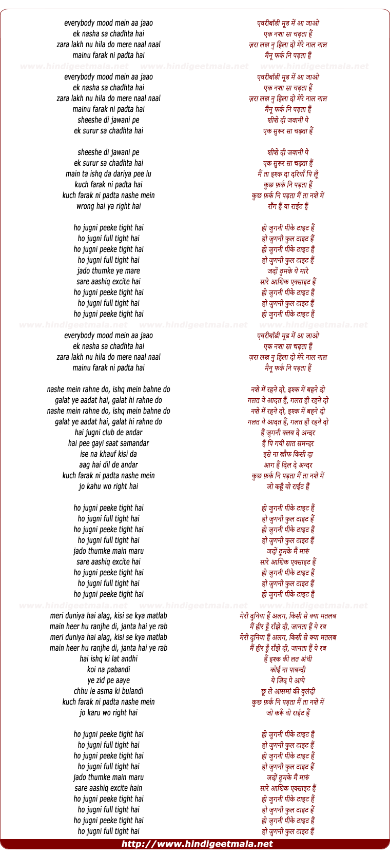 Lyrics of Jugni Peeke Tight Hai - II - एवरीबॉडी मूड में आ जाओeverybody mood mein aa jaao