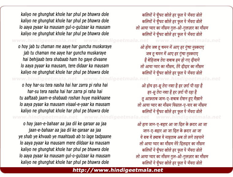 Lyrics of Kaliyo Ne Ghunghat Khole - कलियों ने घूँघट खोलेkaliyo ne ghunghat khole har phul pe bhawra dole