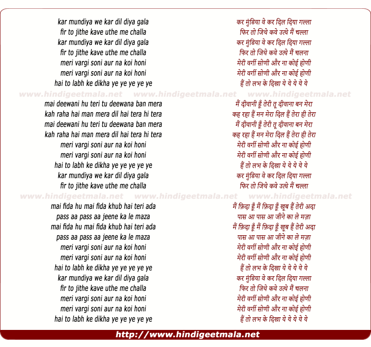 Lyrics of Kar Mundiya We Kar Dil Diya Gala - कर मुंडिया वे कर दिल दिया गल्ला