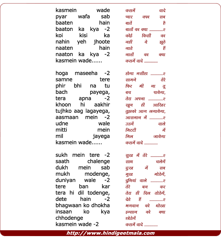 Lyrics of Kasmen Wade Pyar Wafa Sab Baaten Hain - कसमे वादे प्यार वफ़ा सब बातें हैं बातों का क्याkoyi kisi ka nahi ye jhoothhe,