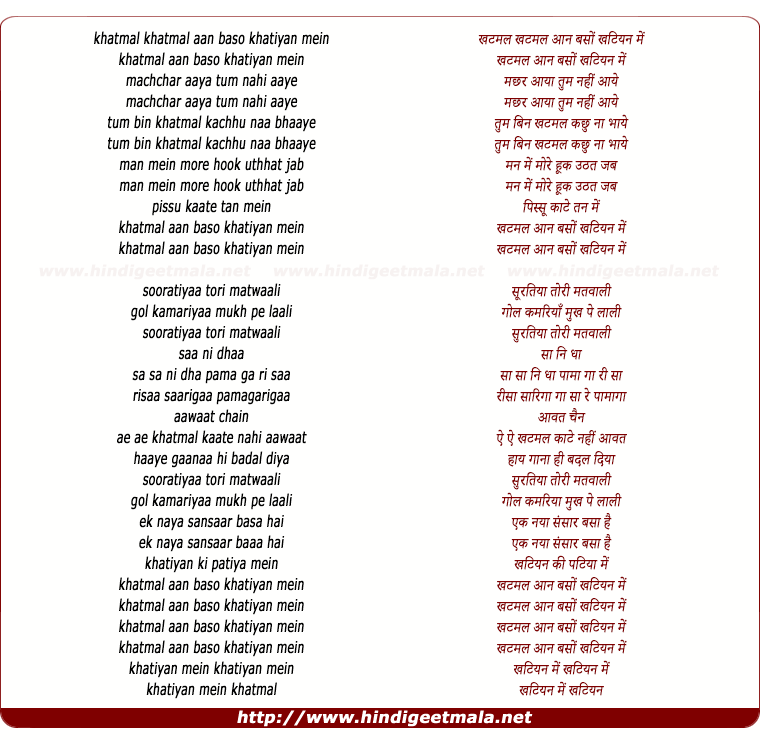 Lyrics of Khatmal Aan Baso Khatiyan Me - खटमल आन बसों खटियन में