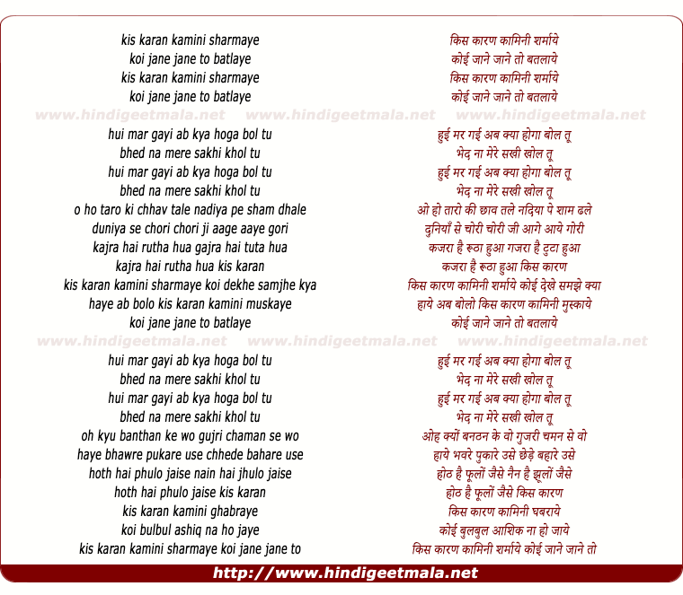 Lyrics of Kis Karan Kamini Sharmaye Koi Jane To Batlaye - किस कारण कामिनी शर्माये कोई जाने तो बतलाये