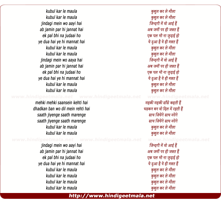 Lyrics of Kubul Kar Le Maula - कुबूल कर ले मौला