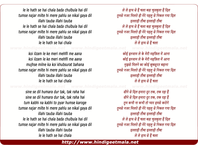 Lyrics of Le Le Haath Se Chala Bada Chulbula Hai Dil - ले ले हाथ से हैं चला बड़ा चुलबुला हैं दिल